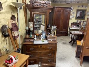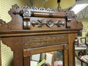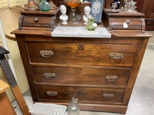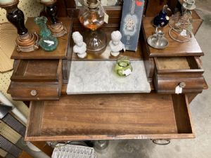 This antique vanity has alot of details worth mentioning - just check out the detailed carving of the wood at the top, above the mirror and how about the small marble top to gives it a pop of color. Also notice all knobs/handles are original :) I specifically like that the drawers on top are made to look like a mini version of a roll top desk but they are indeed drawers.