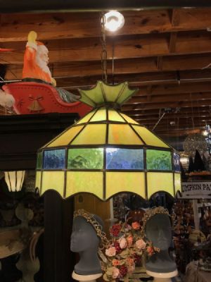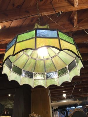 1979-80's Stained Class Chandelier. Requires one bulb, max 100 watt. Approximately 12" in height and approximately 32" in diameter.